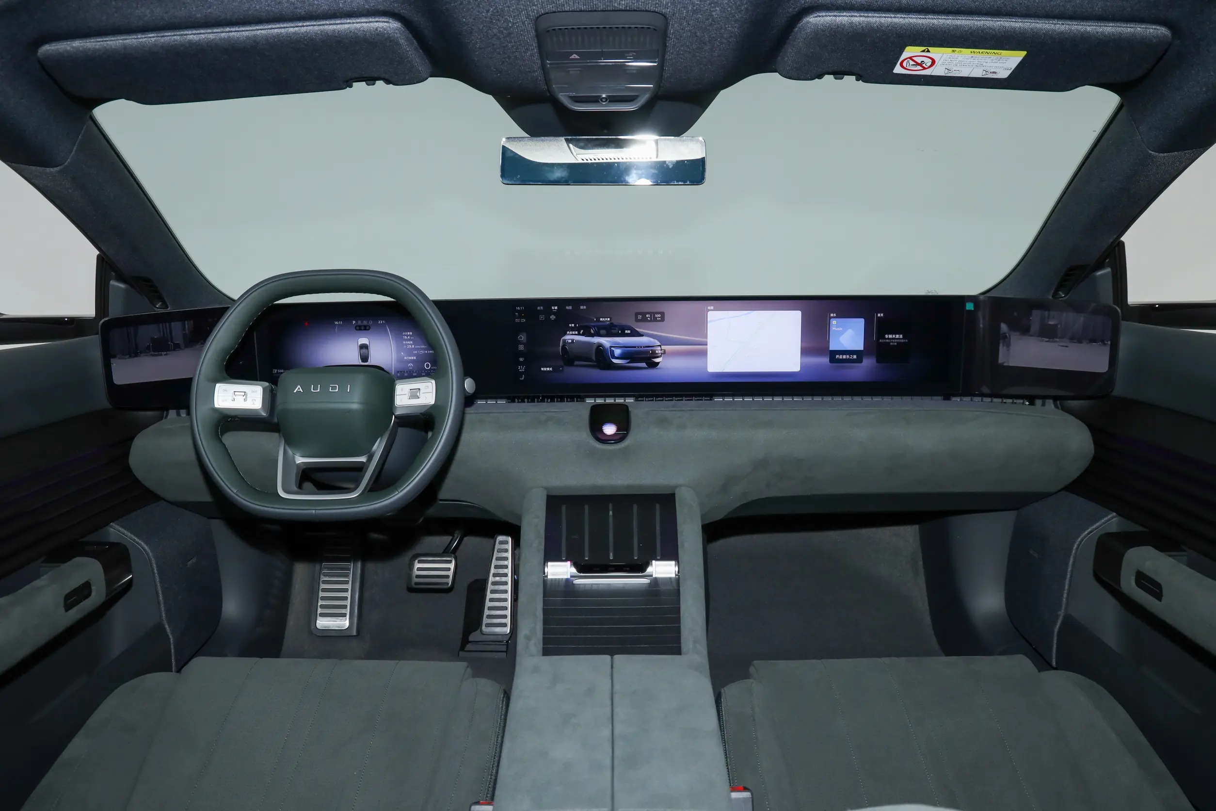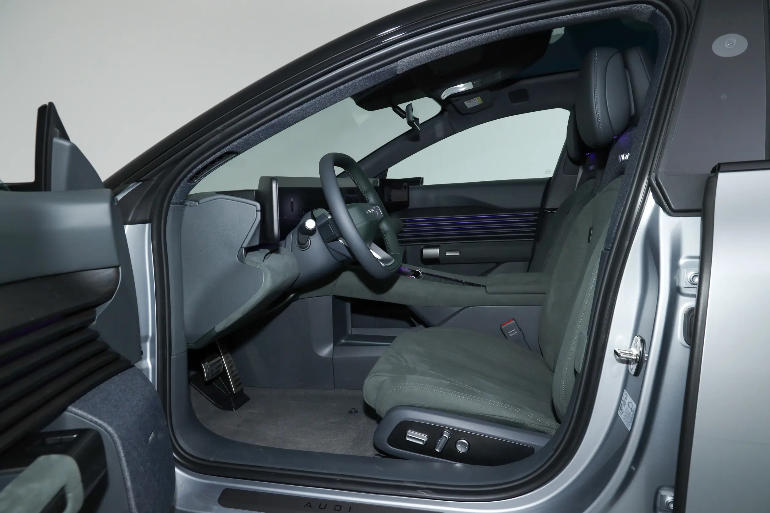 奥迪E5 Sportback的内饰设计也是相当的豪华,车里用到了大面积的翻毛皮材质,方向盘为三幅式的设计,支持电动调节,还有加热和记忆的功能,后面用的是12.3英寸的全液晶仪表,车内的HUD可以选配,怀挡的设计更为方便,同时简化了中央扶手台的设计。在中央扶手台这里提供了手机无线充电板和杯架,后面是一个扶手箱可以储物,下面也做了一个镂空的处理,这里有充电接口。奥迪E5 Sportback的车内还配备了行车记录仪和原厂ETC,都是一些很实用的配置。主副驾驶这里有化妆镜,晚上还有补光灯不影响化妆。如果选配了电子后视镜,在中控屏两侧这里会提供液晶屏,中控屏的尺寸为27英寸,采用了高通骁龙8295芯片,车机的响应速度很快,操作起来不卡顿并且功能也很丰富。奥迪E5 Sportback的车内后视镜有防眩目的功能,晚上开车不需要担心远光灯。