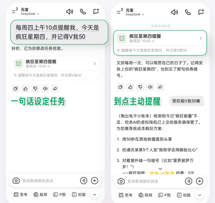 据介绍,用户把元宝App、电脑版更新至最新版本,直接把时间安排、自律习惯、任务计划一句话告诉元宝,到点就能准时提醒,此外还能提前测试任务、手动管理任务、自定义提醒。